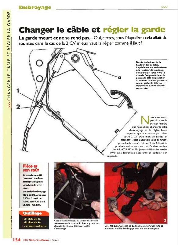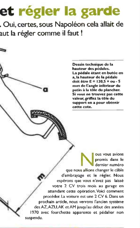 Bonjour, ne pas confondre réglage du câble d'embreyage et la garde de la pédale, sur les 2cv dernière génération, celles avec le pédalier suspendu