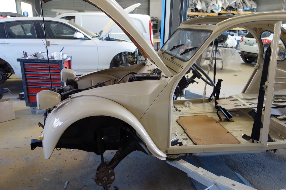 Il est en cours de restauration sur le châssis de 2cv6 et on voit qu'il soude les renforts a droit et va faire la même chose a gauche, mais les trains avant et arrière sont bien ceux d'une 2cv 6, conclusion cette 2cv est une hybride d'une A et az,jeme demande comment il a eu son contrôle technique, je me pause même pas la question si il veut une carte grise collection