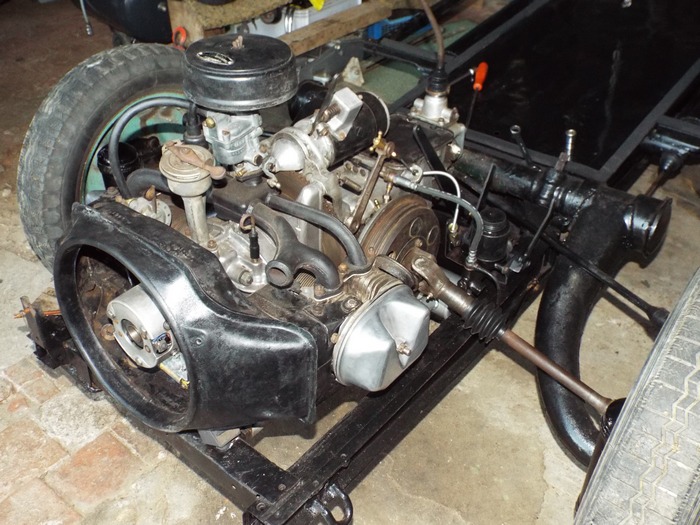 Ces :enerve: de câbles de frein à main m'ont retardé de plusieurs semaines :( Mais maintenant que le problème est résolu, j'ai pu remonter l'ensemble moteur boite sur le châssis.