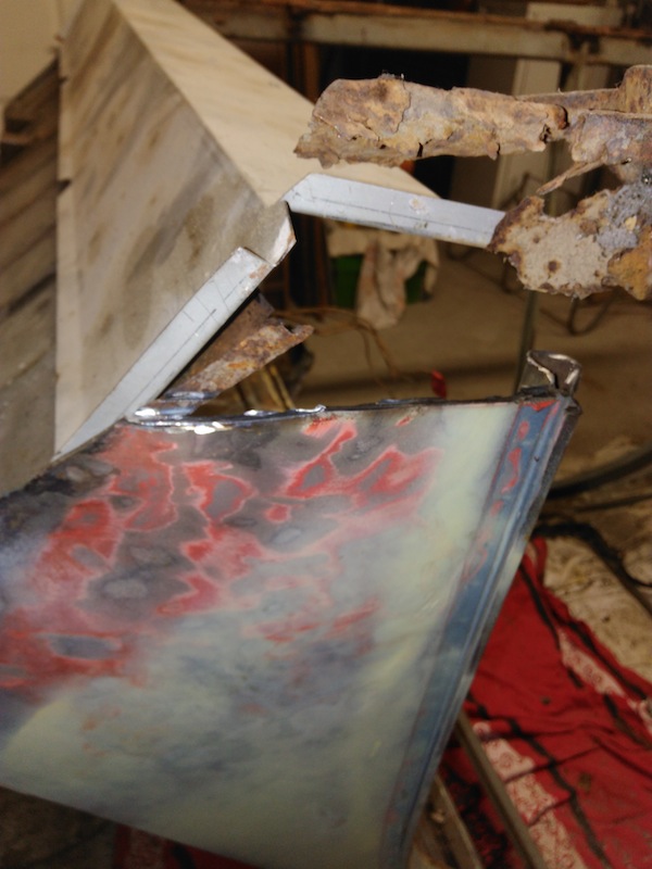 Alors là suite en photo, c'est à dire soudure fond de coffre, et découpage de la queue de pie arrière gauche et remise en place d'une autre façonnée à partir d'une simple tôle ! Je n'en suis pas peu fier