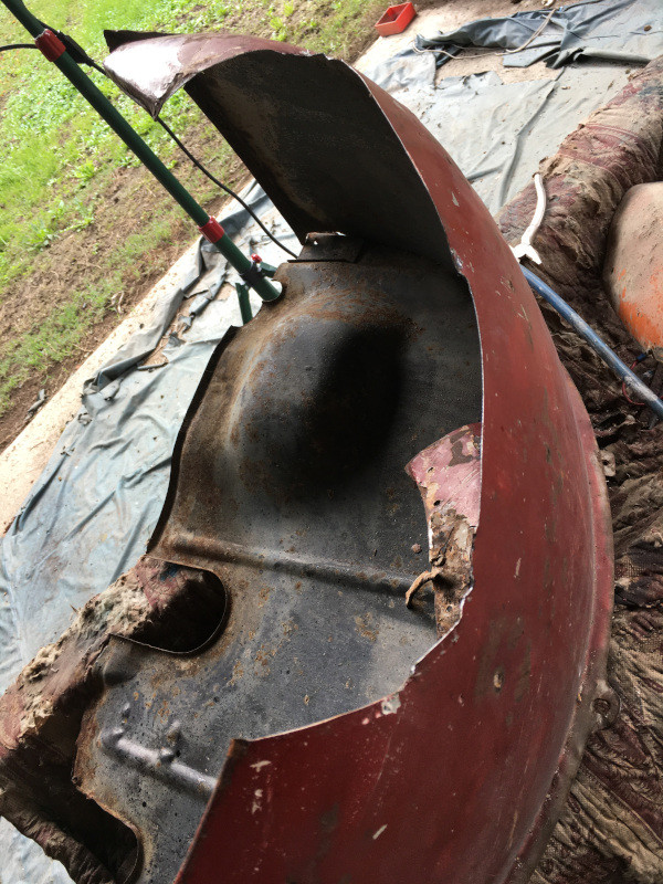 J'ai récupéré cette tôle (comme tu le sais déjà, je récupère à peu près tout...) qui était donc déjà partiellement formée, et que j'ai commencé à reformer pour pouvoir la souder ensuite en "bord-à-bord".