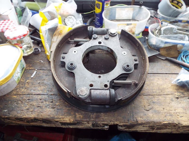 Je sors le plateau de frein et le met sur l'établi : c'est un avantage des types H de pouvoir sortir l'ensemble du frein, cylindres et garnitures, et de pouvoir travailler sur l'établi.