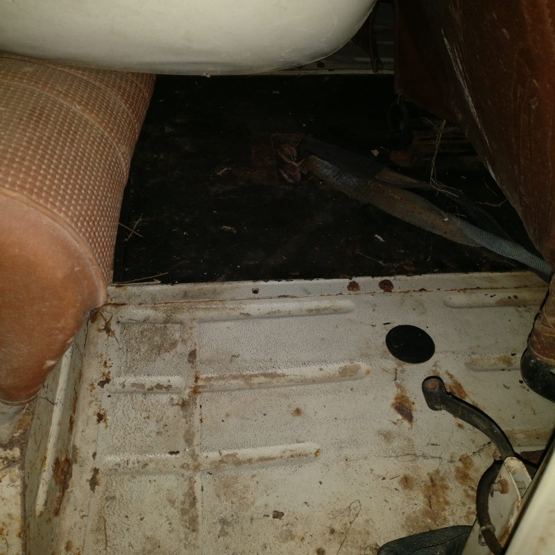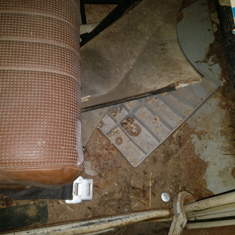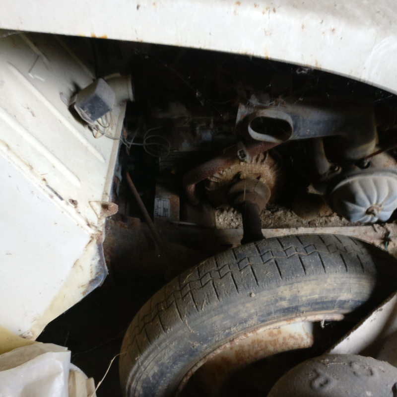 y'a du boulot : pots de suspension bouffés par la rouille (à changer), plancher avant bouffé par la rouille, mais retolé-riveté, une aile avant à changer, ligne d'échappement à refaire, pneus complètement à plat...