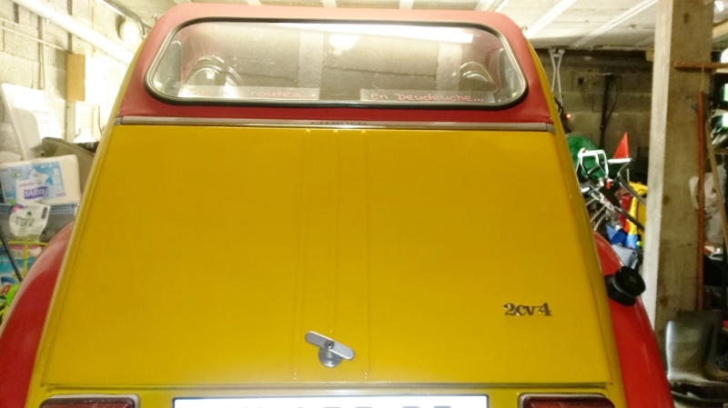 voilà j'ai pu fixer mon logo " 2cv 4" sur la malle arrière, j'ai visionné plusieurs photos de malles avec des logos du même type, et j'ai fais un semblant de calcul.