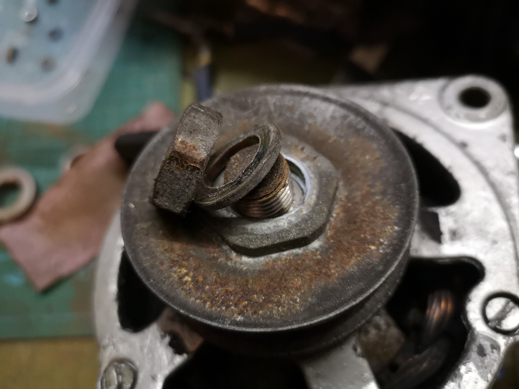 Ordre d'assemblage des rondelles-écrous-espaceurs. (oui, c'est un autre alternateur, j'ai dû le démonter parce que j'avais oublié de photographier le premier...) Les deux demi-poulies devraient sortir facilement. Sinon, un extracteur aide pas mal... Attention à la clavette!