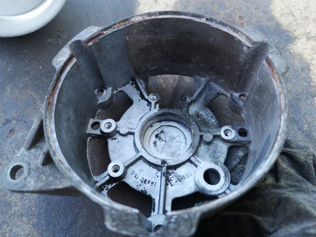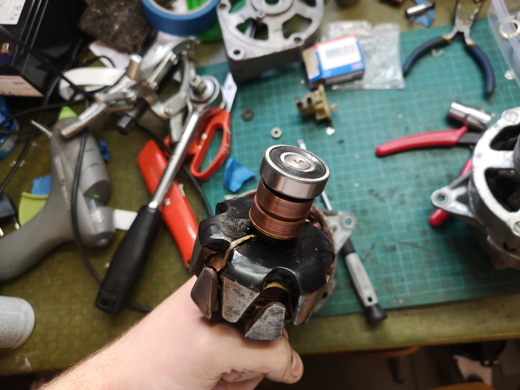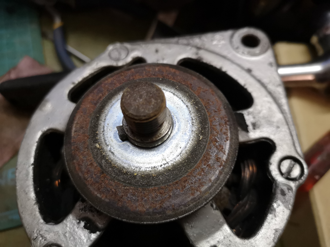 L'axe du rotor se détache du carter avant avec un maillet assez aisément. Le roulement arrière est monté sur le ressort. Je l'ai sorti avec un extracteur (l'axe n'a pas de trou de centrage, j'en ai pointé un moi-même).
