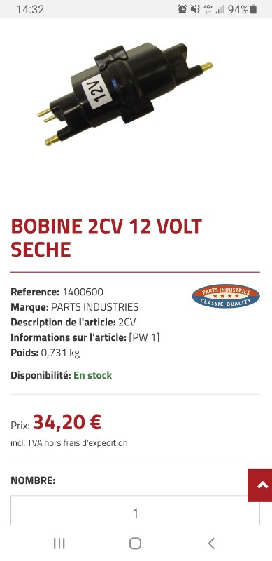J'ai commandé aussi cette bobine sèche et par la même un kit rupteurs et condensateur ducelier à mettre dans la pochette de secours en cas de panne même si j'ai bien compris que c''est du chinois.