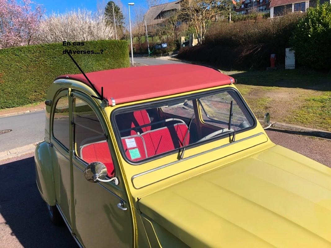Aucune infiltration. Il y a le joint sous la barre transversale avant qui joue son rôle. Quand à la sangle, elle refait un petit tour par dessus le portique et ne gêne pas du tout. Pour le trou dans la capote au milieu, j'aurai trop peur d'une déchirure ...deuch25 a écrit : ↑15 août 2023, 10:01 Salut les amis deuchistes,