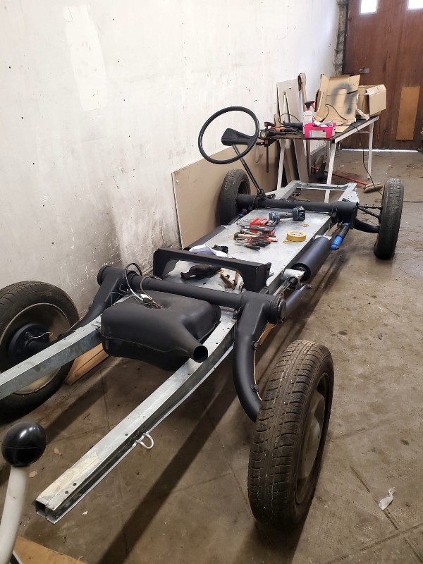 je suis aussi allé chercher une bonne commande de pieces : le chassis galva freinage pas mal de carosserie pour la caisse qui est complètement pourrie,pneus capote etc etc une belle facture pour commencer ...