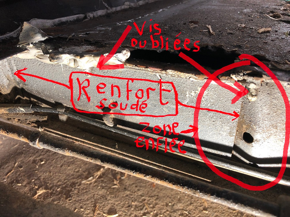 donc en résumé le chassi a ete mortelement disqué et les toles plancher chassis : pas rebouchonnées , puis le plancher pedale pas ressoudé mais collé au silicone