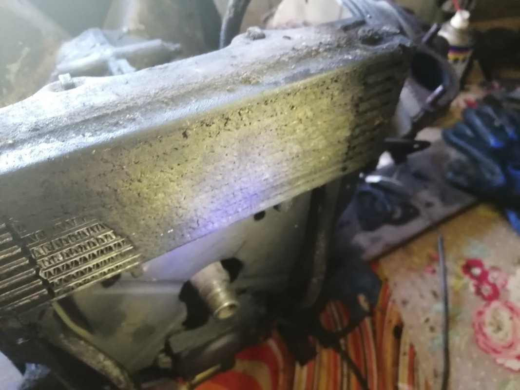 Je démonte les accessoires de mon vieux moteur pour nettoyage, et je ne résiste pas à vous partager cette image du radiateur, visiblement inviolé depuis 1969