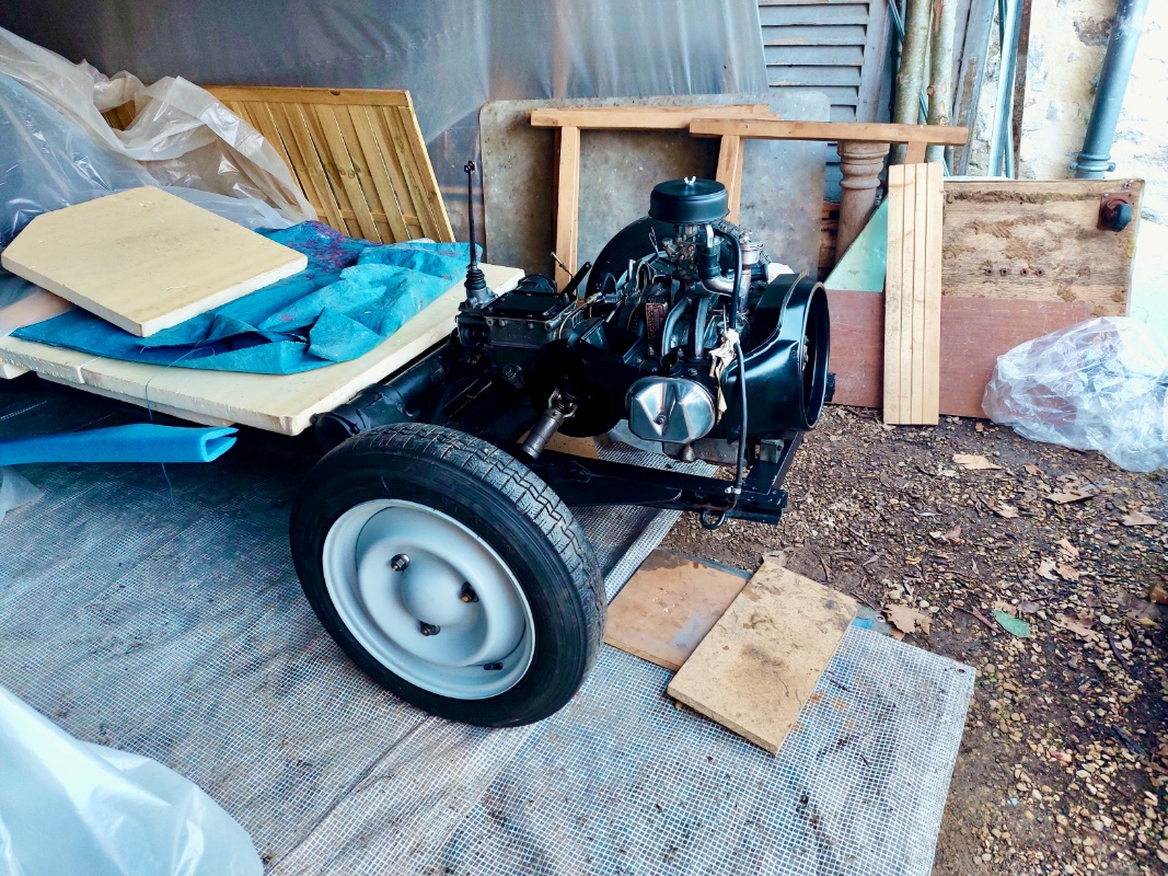 Châssis et moteur finis, cabine en cours de décapage, changement de tôles en dentelle, ferose, soudure, étamage.
