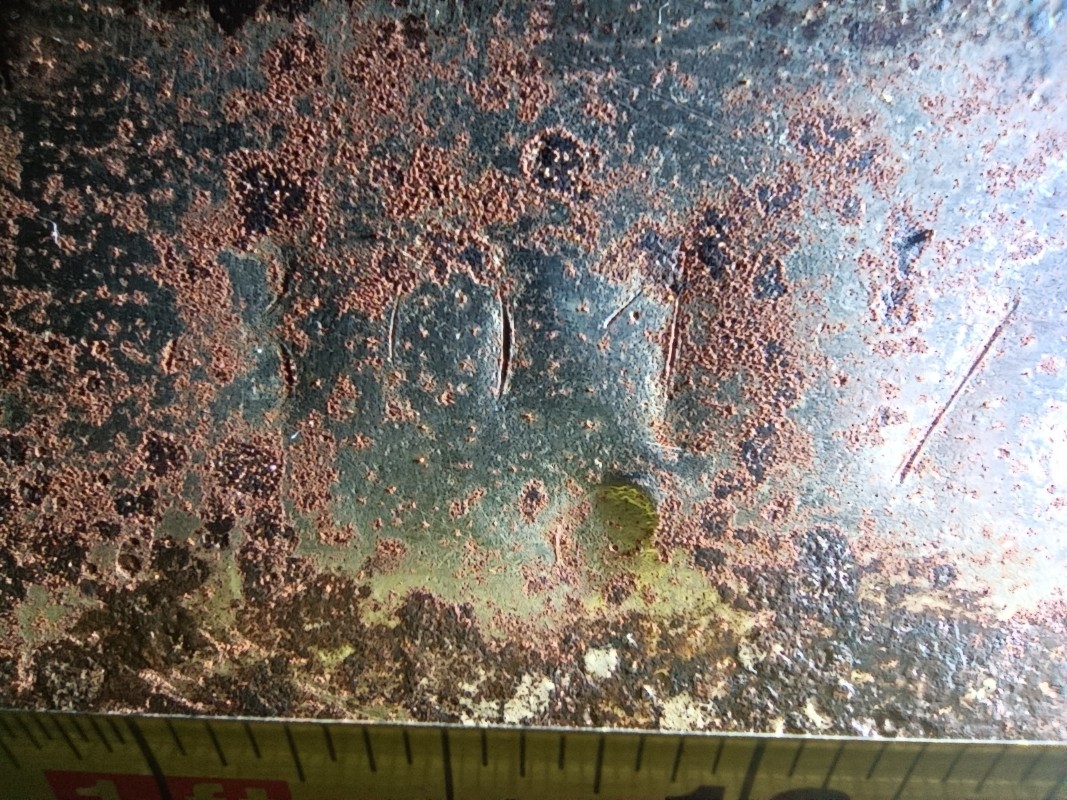 Grâce à ce forum, j’ai maintenant localisé le numéro frappé à froid sur le plate-forme près du siège passager, qui, je pense devrait être le même que le numéro de série sur la plaque du constructeur. Malheureusement, le nombre frappé à froid n’est pas concluant en raison de la difficulté à lire les chiffres, de la rouille et d’un mauvais frappé.