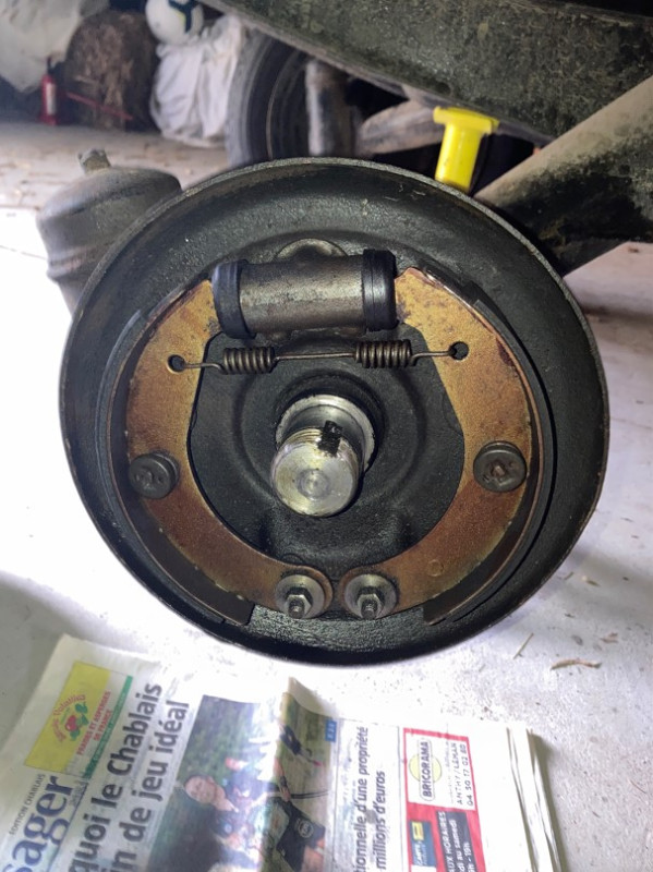 Méfies-toi, si tu appuies sur la pédale alors que les tambours ne sont pas montés tu risques de faire sortir les pistons du cylindre de frein, en temps normal, les mâchoires se bloquent contre le tambour.