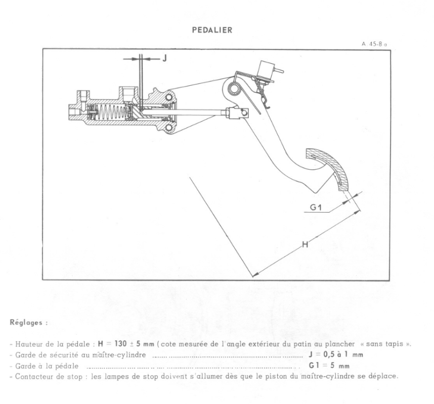 Voici la procédure de contrôle de la garde de sécurité du maître-cylindre (repérée "J" sur le schéma) est d'environ 1 mm.