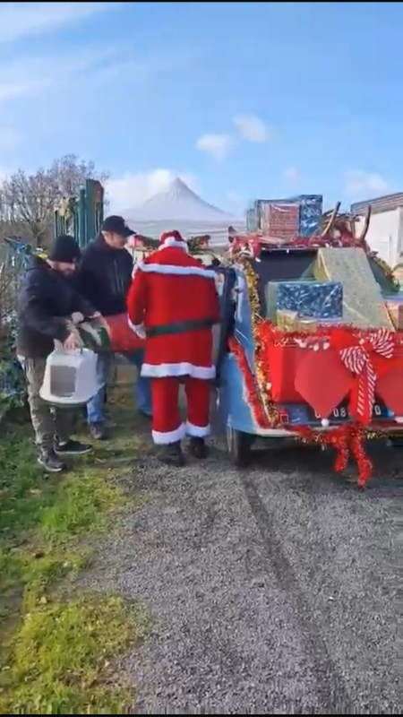 Papa 2cv arrive pour distribuer des cadeaux dans un refuge animalier