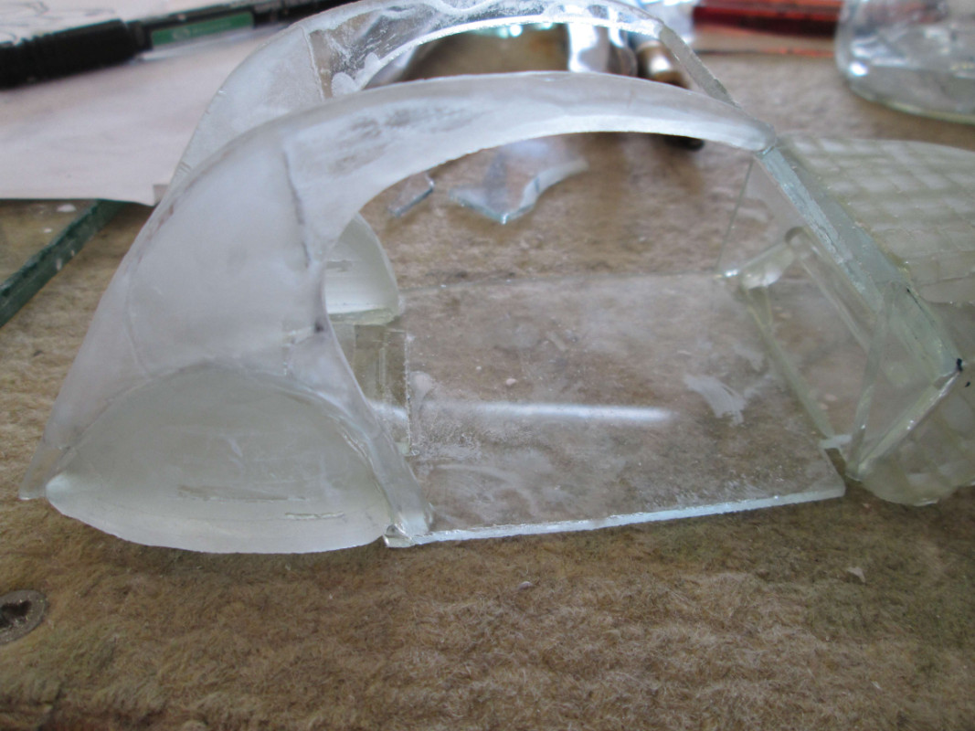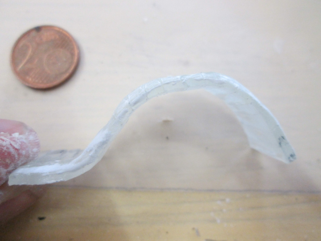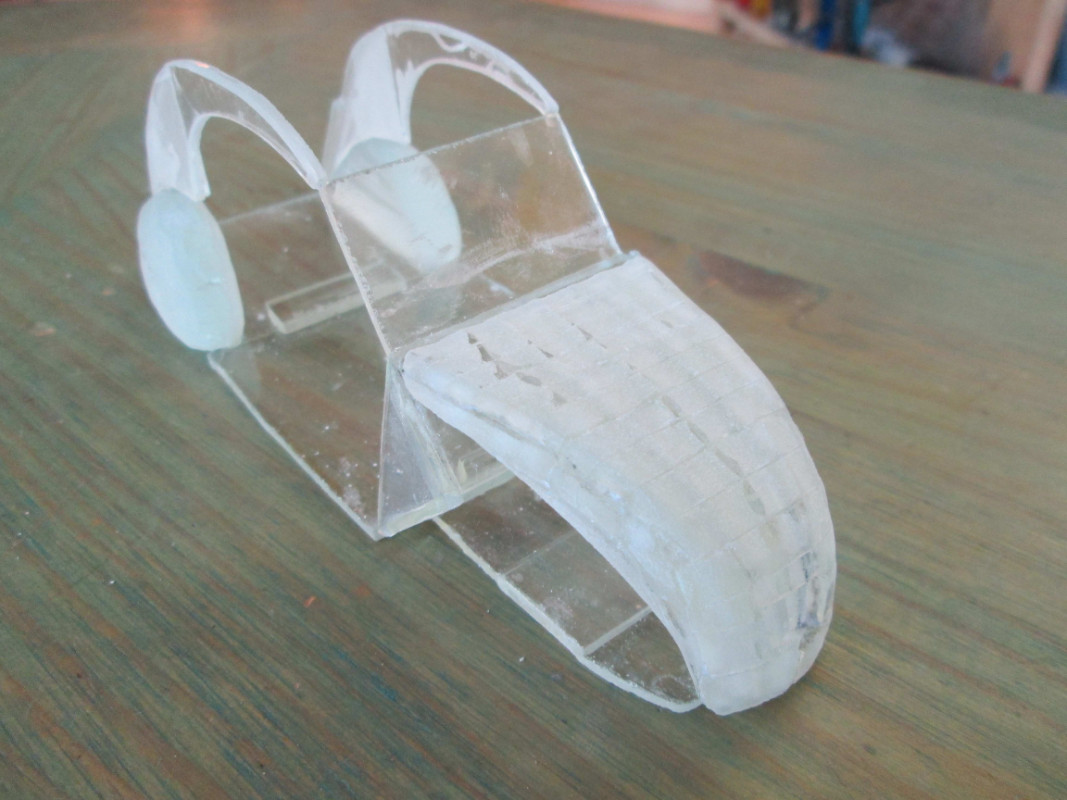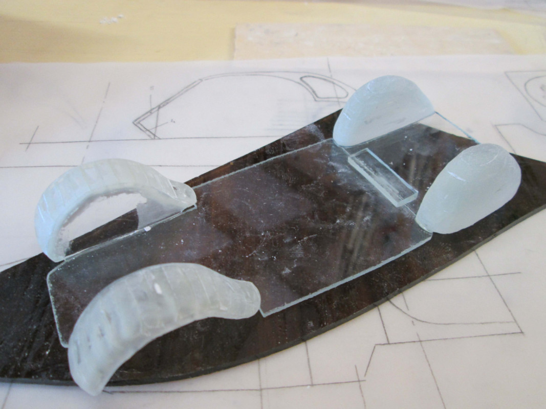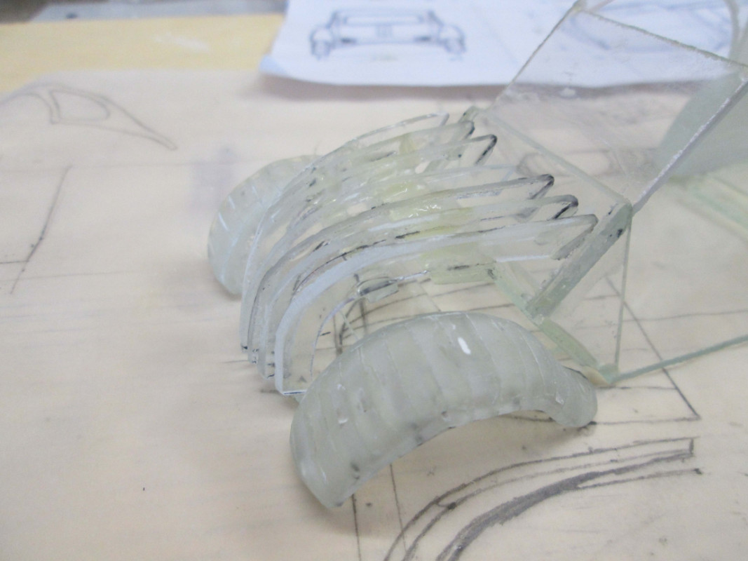 Les marques que tu vois sont le fait que les ailes avant et le capot sont fait à partir de lamelles de verre de 3m/m d’épaisseur et de 4m/m de large. pour le montage, j'ajuste les champs des lamelles entre elles et ensuite elles sont collées champ contre champ. Je me sert d'un moule en carton ...