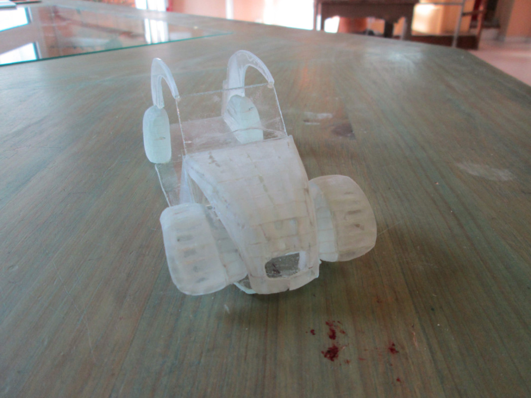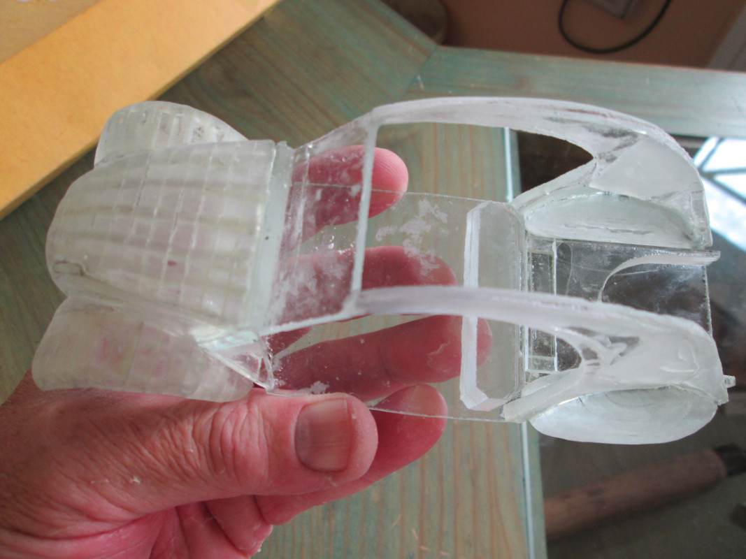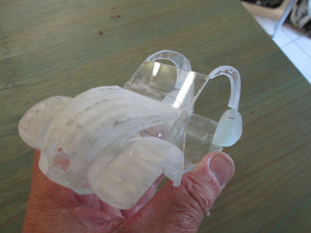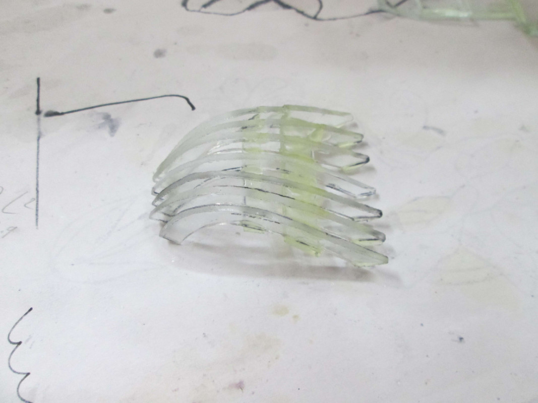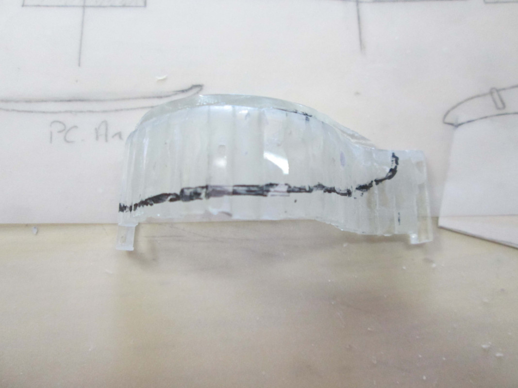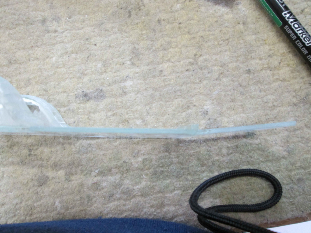 Les marques que tu vois sont le fait que les ailes avant et le capot sont fait à partir de lamelles de verre de 3m/m d’épaisseur et de 4m/m de large. pour le montage, j'ajuste les champs des lamelles entre elles et ensuite elles sont collées champ contre champ. Je me sert d'un moule en carton ...