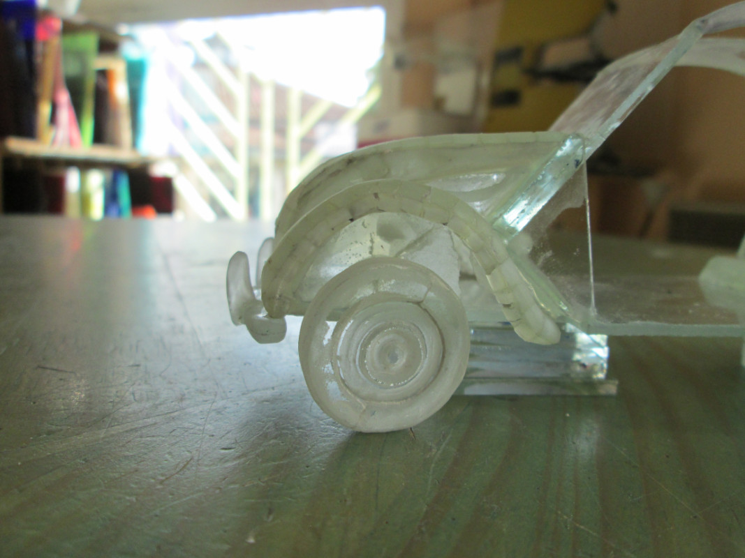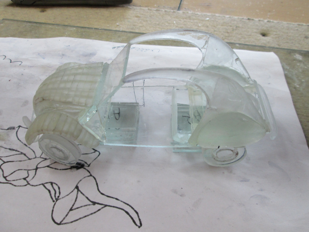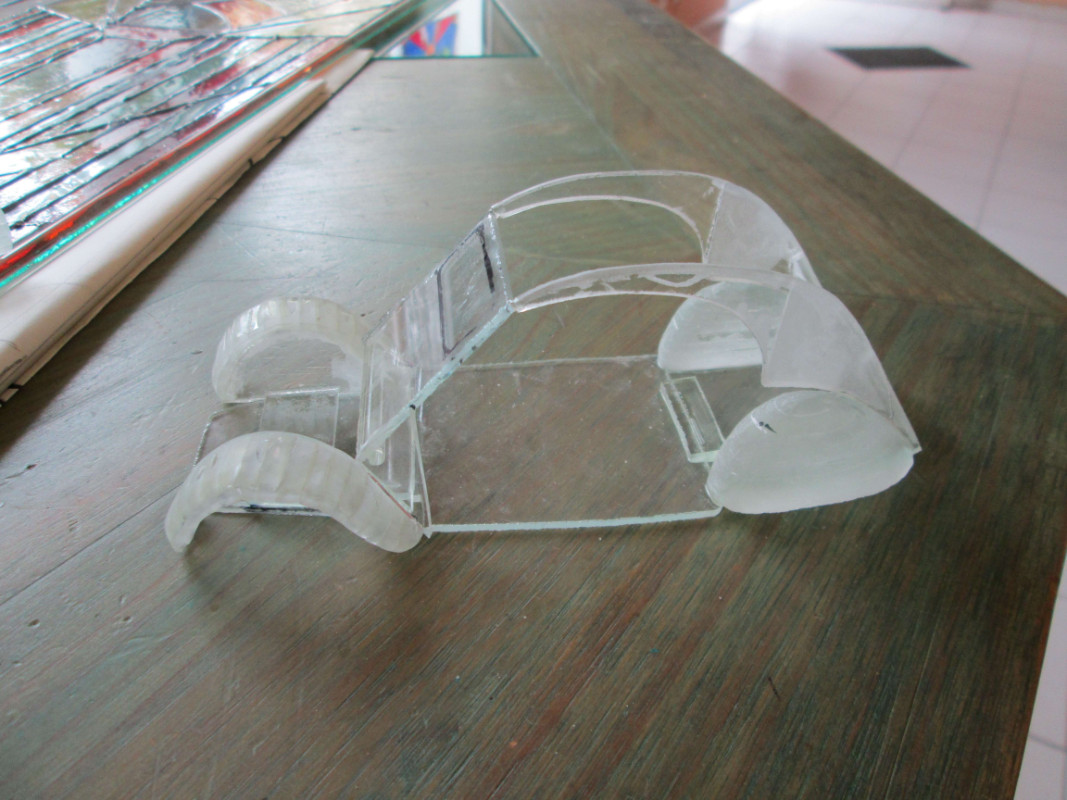 Je reviens sur le forum pour tenir ma promesse. Je n'est plus toutes les photos de la deuch, mais je vais poster celles que j'ai. Je ne vais pas remettre toutes les explications, mais juste un petit topo. J'ai fait la 2cv en lamelles de verres (j'étais souffleur de verre) que j'ai collées puis ...