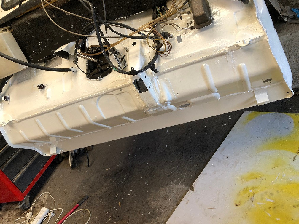 troooop plein de soucis mais c'est reparti ,la tolerie neuve est en place et repeinte comme la joconde et le chassis refermé a vu sa premiere couche de blanc glycero a l'ancienne par Louis le renoooov