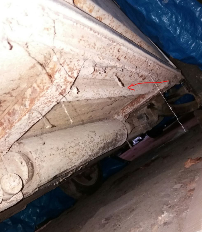 Sur la photo, on ne vois pas très bien, mais la partie au bout de ta flèche rouge fait normalement partie de la caisse et non du châssis. Seules les 4 rallonges transversales sont soudées au châssis.