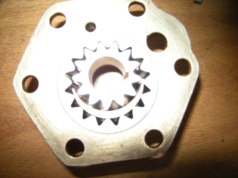 Ta pompe doit être bloquée car elle semble en contrainte à cause des morceaux de fer entre dentelures et cannelures ( :D ) sur la photo on dirait que l'espace entre l'engrenage et le corps est moindre à 4h qu'à 10h ... peut être tu pourrais essayer d'extraire ces intrus pour libérer cette contrainte ?