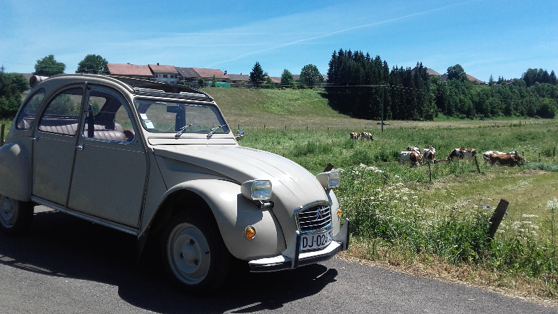en 2014, la famille organise un picnic au bord du Doubs.. si on y allait en 2CV ce serait rigolo..