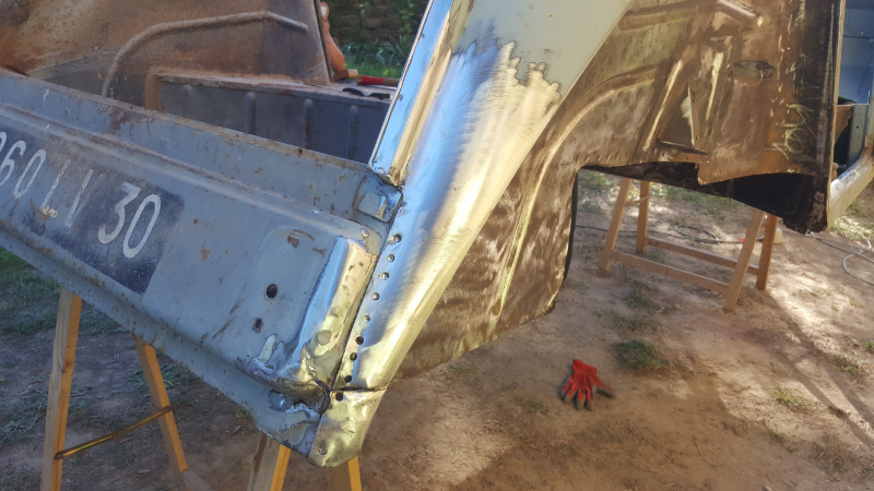 Mon neveu m'a aidé sur la queue de pie à redresser car elle était toute enfoncé. J'ai dépointé les soudures pour pouvoir lui refaire prendre son galbe au mieux.