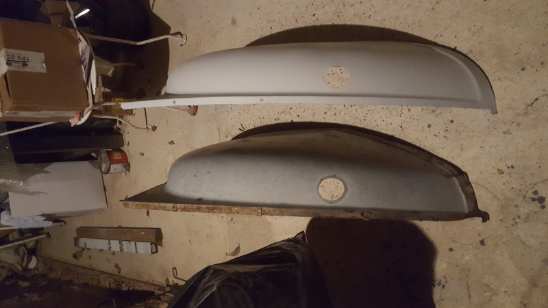 Ensuite j'ai passé une couche d'apprêt garnissant sur toute la caisse, intérieur et extérieur sans oublier le capot qui avait aussi du boulot à faire, les 4 ailes neuves, les 2 portes arrières et les joues d'ailes. J'ai du percer l'emplacement des clignotants sur les ailes avant. Heureusement j'avais les anciennes pour prendre les côtes. Car des ailes neuves avec clignotants rectangulaire, je n'ai pas trouvé.