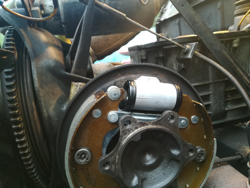 La seconde surprise c'est que mes freins sont plus usés que je ne pensais. Il va donc falloir attendre de recevoir des nouvelles mâchoires. Un cylindre de roue est tout humide de liquide frein sous le caoutchouc donc si j'en crois mon tuto, c'est mauvais signe (pourtant pas d'écoulement visible et l'intérieur du tambour a l'air plutôt sec... mais très poussiéreux). Ce serait con de pas en profiter pour tout remettre à neuf. J'irai à vélo prendre le car en attendant les pièces...