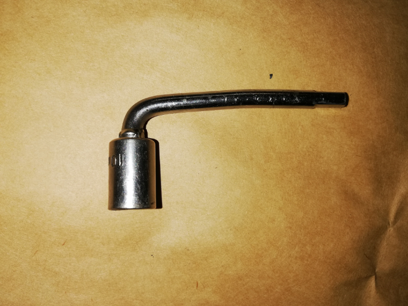 Une clé de 10 coudée pour sortir facilement les boulons des cylindres de roues.