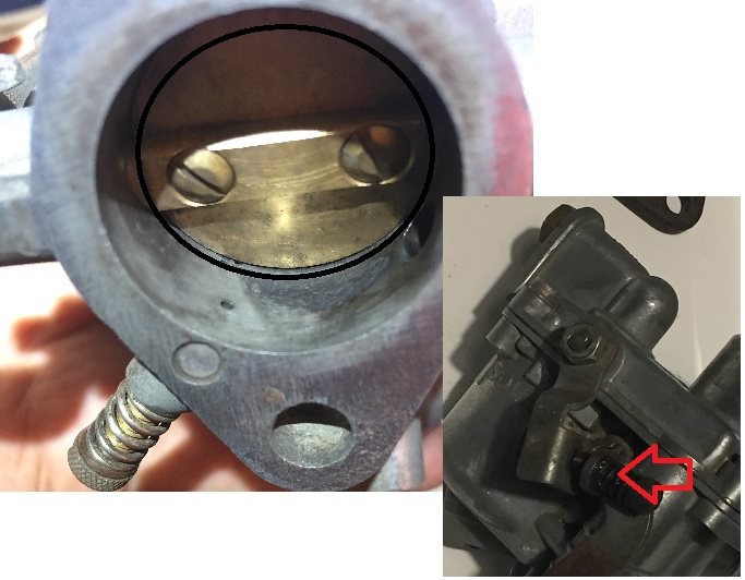 A l'aide de la vis à ressort en haut du levier de l'accélérateur, régler la position du papillon des gaz pour que les 3 trous de progression (à gauche) soit juste recouverts par le papillon des gaz (position du papillon en noir) lorsque le levier est plaqué contre la butée (flèche rouge)