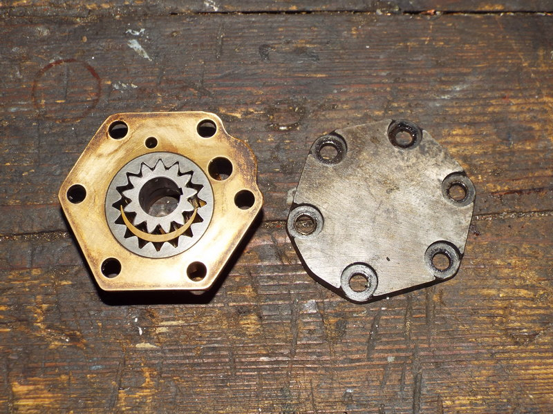 La pompe à huile est une pompe à engrenages droits, avec le rotor entraîné par une clavette sur l'arbre à cames. Elle n'est pas refabriquée. La même que celle des AZ d'avant 1963. Celle qu'on trouve c'est celle des moteurs plus récents.