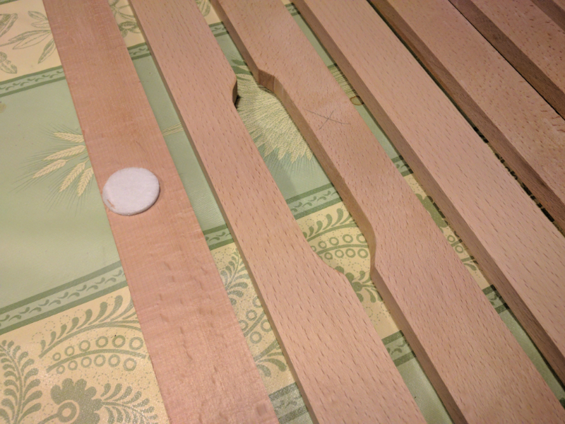 Détail de l'angle vu de dessous, avec l'équerre métallique, le taquet et le patin.