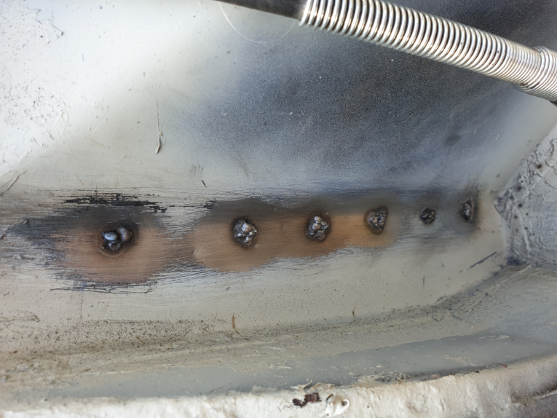 Jai fait une réparation, sans doubler les toles, avec du 1.2mm que j'avais chez moi, j'en ai soudé une partie par points, une au bouchonnage et les plaques elles-mêmes bord à bord . Voilà ce résultat, cest a fignoler