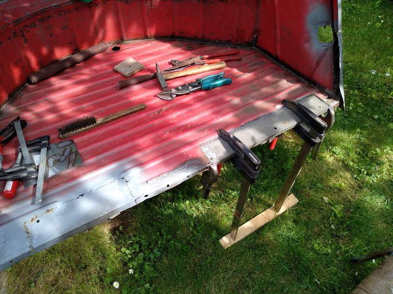 Pré-positionnement : Vérification et maintien en position par rapport à la porte du coffre arrière : Points de soudures à gauche : Points de soudures à droite : Résultats en attendant la suite : J'ai ensuite passé un coup de galvanisation en bombe pour protéger de l'oxydation.