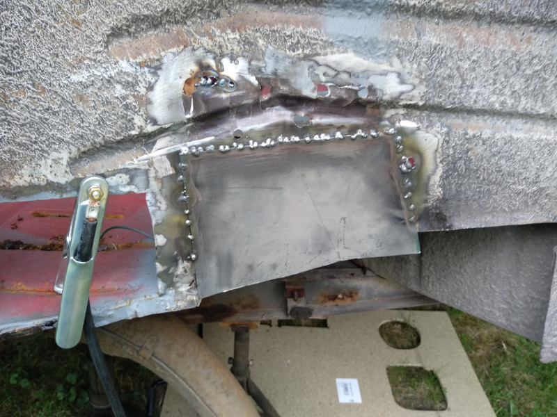 Juste un gros trou à boucher et ensuite remettre le renfort pour fixer la ceinture. Mise en forme de la tôle pour boucher le trou : Tôle en place, mais j'ai encore fait des trous qu'il faudra boucher... J'ai mis quelques rustines, ça bouche les trous ! A+