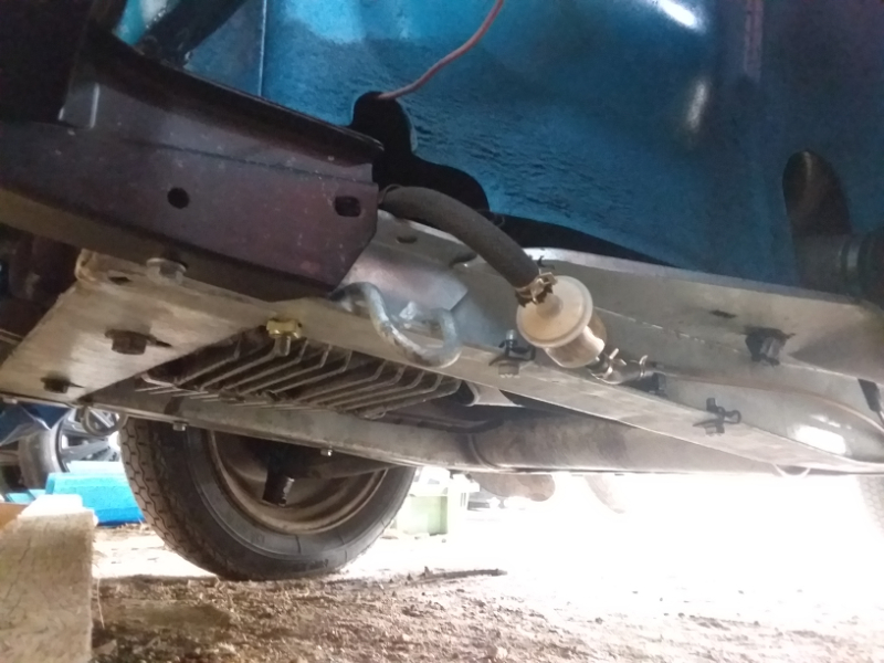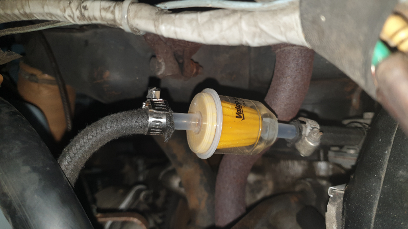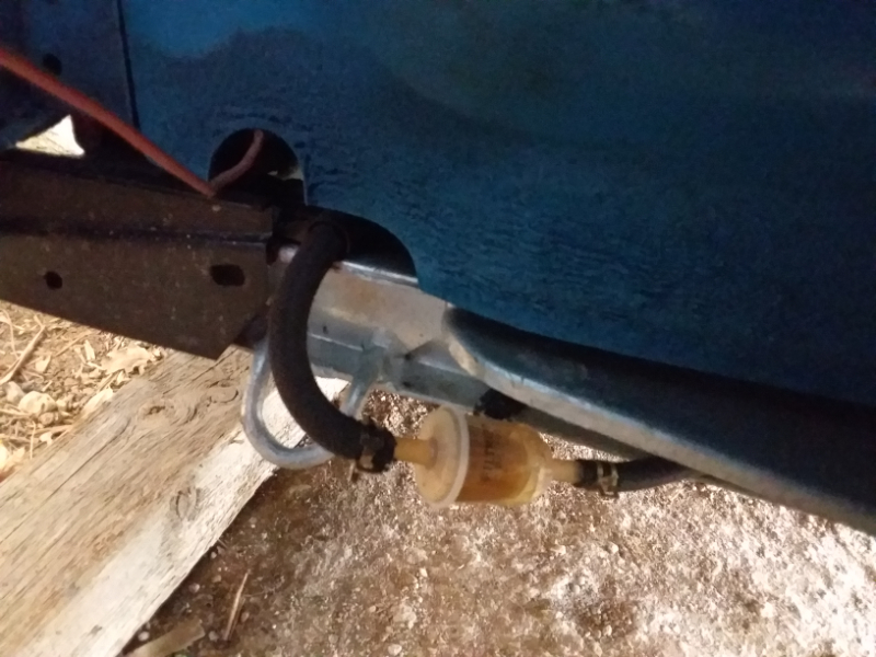 J'ai positionné un filtre à essence avant la pompe à essence dans le côté du châssis juste avant le coude de remontée de la durite.