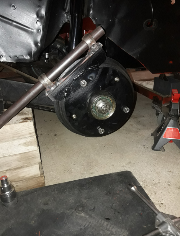 Je n'ai pas bien compris, tu présentes des photos de la réalisation de l'outil pour bloquer le tambour lors du serrage (ou desserrage) de l'écrou de fusée, avec l'outil monté sur le tambour arrière.