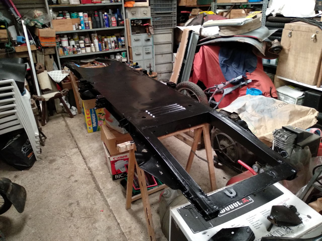 Plateforme galvanisée stockée après réception début 2019... Pour commencer une couche d'impression "spéciale" pour support galvanisé Quelques temps plus tard (en fait un an après, au début du confinement) peinture noire sur la plateforme ;
