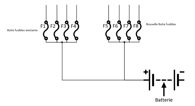 Attention : le fil qui part de la batterie ( que tu appels fil + vers connexions fusibles ) doit être protégé au plus près de sa borne +, un fil qui se décroche et qui touche la carrosserie prend FEU en peu de temps.