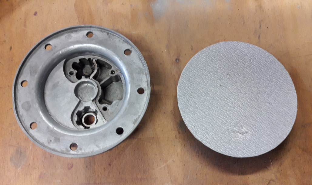 pour obtenir une planéité des plans de joint j'ai déjà dressé le corq ( photo 4 ) de pompe ensuite j'ai équipé un disque de 100 m/m en inox que j'avais en stock avec du double face ultra mince et j'ai découpé et collé du papier à poncer ,j'ai réussi à enlever les aspérités et les éventuels déformations pour obtenir une planéité parfaite en utilisant du BelGom Alu comme pâte à poncer .