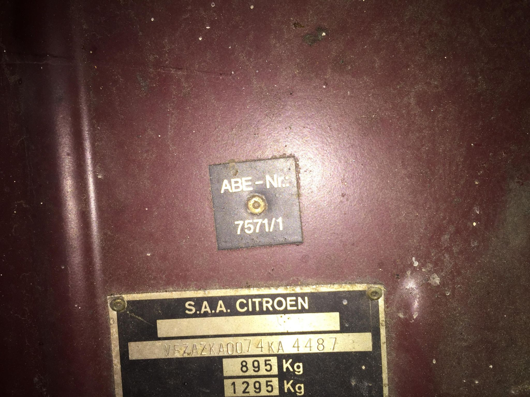 Il s'agit d'une Charleston de 1980 (modele 1981) importe de l'Allemagne. La peinture est impec, l'intérieur est super - toujours avec la banquette 'pied de coq' noir et blanc, etc... Mais sous le capot, y a un truc qui colle pas. Je n'ai jamais vu de plaque comme ca, a part des fausses. Pourquoi deux numéros a la filee? Et le code couleur n'y est pas - a la place ce ABE-Nr truc chose (surement nummer abbrevie de l'allemand).