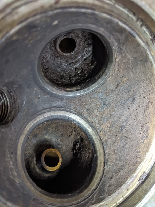 Voilà d'abord la moins abimée : En soit les sièges doivent rectifiables, mais la chambre de combustion à l'air d'avoir perdu de la matière. Toute la chambre devrait être comme au niveau du morceau qui reste sur la gauche non ?
