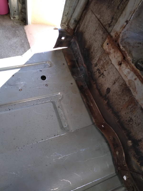Je suis rendu à préparer mes tôles plancher à poser . Lors de la dépose avec un foret à dépointer l ancien plancher était soudé par dessus la tôle arrière et soudé sur la bas de caisse à son bon emplacement.