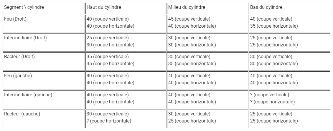 Sur la conlonne de gauche, on a le segment mesuré ; sur la ligne du haut, on a la position dans le cylindre ; enfin, on a la position de la coupe du segment : soit positionnée vers le haut (vertical), soit vers l'avant du moteur (horizontal).
