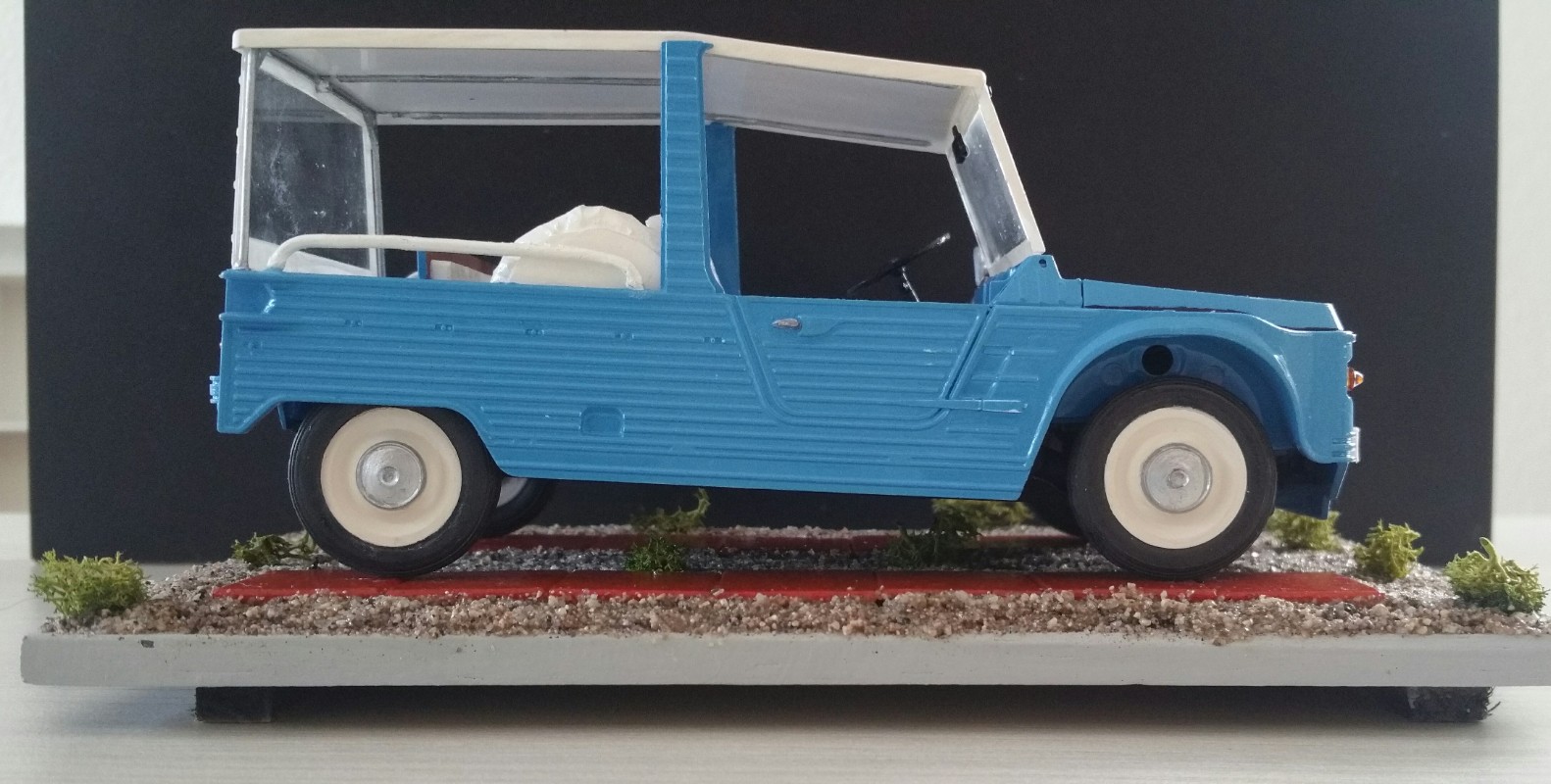 Cette méhari est une réplique de celle possédée par mon beau père et mise dans un diorama qui est exactement la réplique d'où elle se gare.