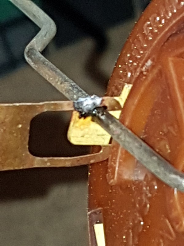 Pour le linguet, j'ai trouvé une lamelle de contact en cuivre, que j'ai soudée à l'étain puis découpée pour réparer le contact.