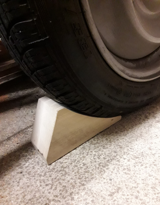 Je vais donc "affiner" le talon de 15 mm qui est un peu trop épais et qui empêche la cale d'être correctement placée sous la roue!