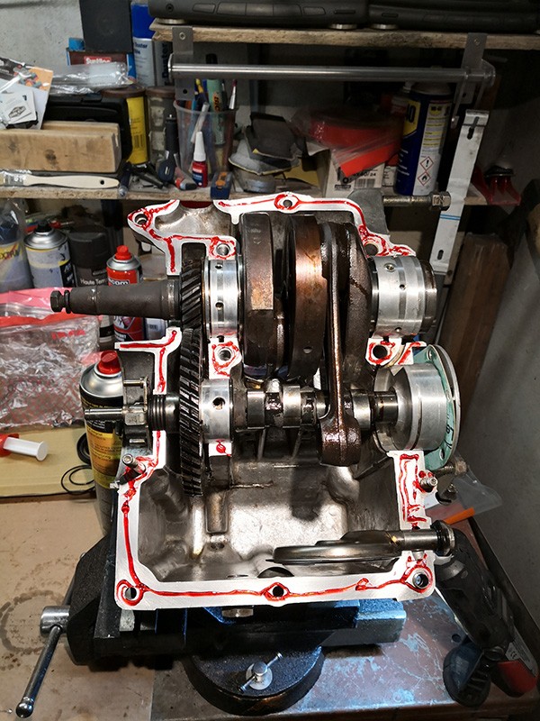 Ok, tout est bon, je mets ma pâte à joint (Loctite 518) Et j'essai de mettre mon demi-carter gauche pour referme mon moteur, et là.......ben non, impossible de refermer le carter.